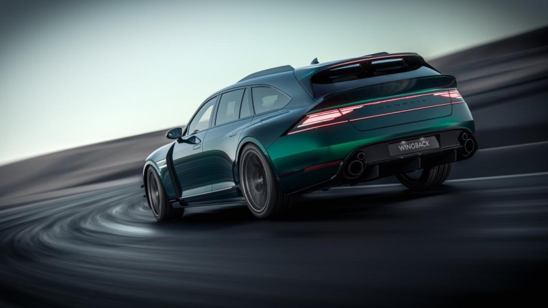 车身的细节设计,更是将“藏锋”的高性能表达贯彻到底。作为一款高性能概念车,捷尼赛思G90 Wingback概念车并未采用夸张的宽体套件与超大尺寸尾翼,而是在品牌经典设计的基础上,通过细节的优化与升级,悄悄释放性能信号。勇者之徽阔型格栅的线条更具张力,格栅下方的空气导流翼片低调却实用,既不破坏前脸的整体优雅感,又能有效优化气流;外扩的轮拱线条流畅自然,与车身融为一体,搭配22英寸定制轮毂,让稳健的运动姿态无需刻意强调;车尾的后扩散器与扰流板,尺寸与比例经过精准把控,在强化空气动力学性能的同时,与上掀式尾门的线条完美衔接,让运动感成为车身设计的自然延伸。